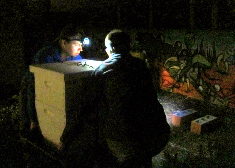 In a few we were home and transporting the hive by head-strapped flashlight into her new home next to the graffiti mural by Quip. Welcome to the ‘hood, girls!