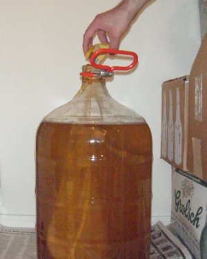 For complexity, we added a dozen sliced apricots to the mix. As you can see, this created a minor disaster when it came time to stuff pasteurized apricots through a tiny hole in the 5 gallon bottle. It’s not hard to imagine feet, floor, bottle covered in sticky orange baby food.