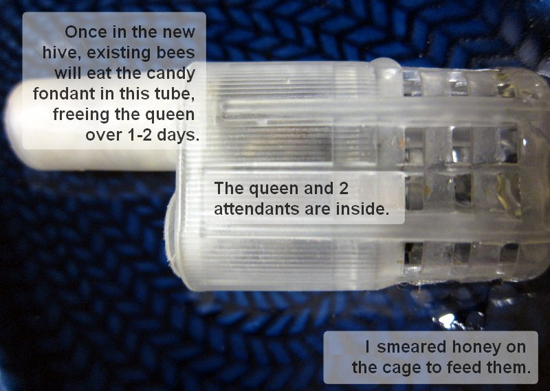 This morning before my 9 a.m. meeting, I installed Good Queen Bess in the lonely hive. And now my job is to wait 3-4 weeks for her to: