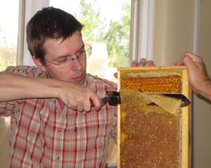 Under the helpful guidance of Bill Tomaszewski of Marin Bee Company, Googlers took turns uncapping the honey (removing the protective wax that bees use to cover a cell once it’s filled with honey), hand-cranking the honey extraction machinery to spin the honey out of the honey comb and pouring the honey through filters to remove the bits of wax and other particles that came from the hive.