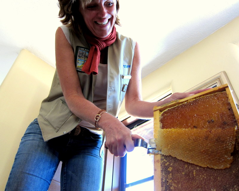 13 SepTogether with Jodi and James from the City Open Space crew, we harvested a box of honey from the cottonwood tree hive. It’s a dark buttery fall honey without a hint of astringency. As part of our volunteer efforts, we kindly tracked honey and mud all throughout the Westside Visitor’s Center and used every wet towel on site.
